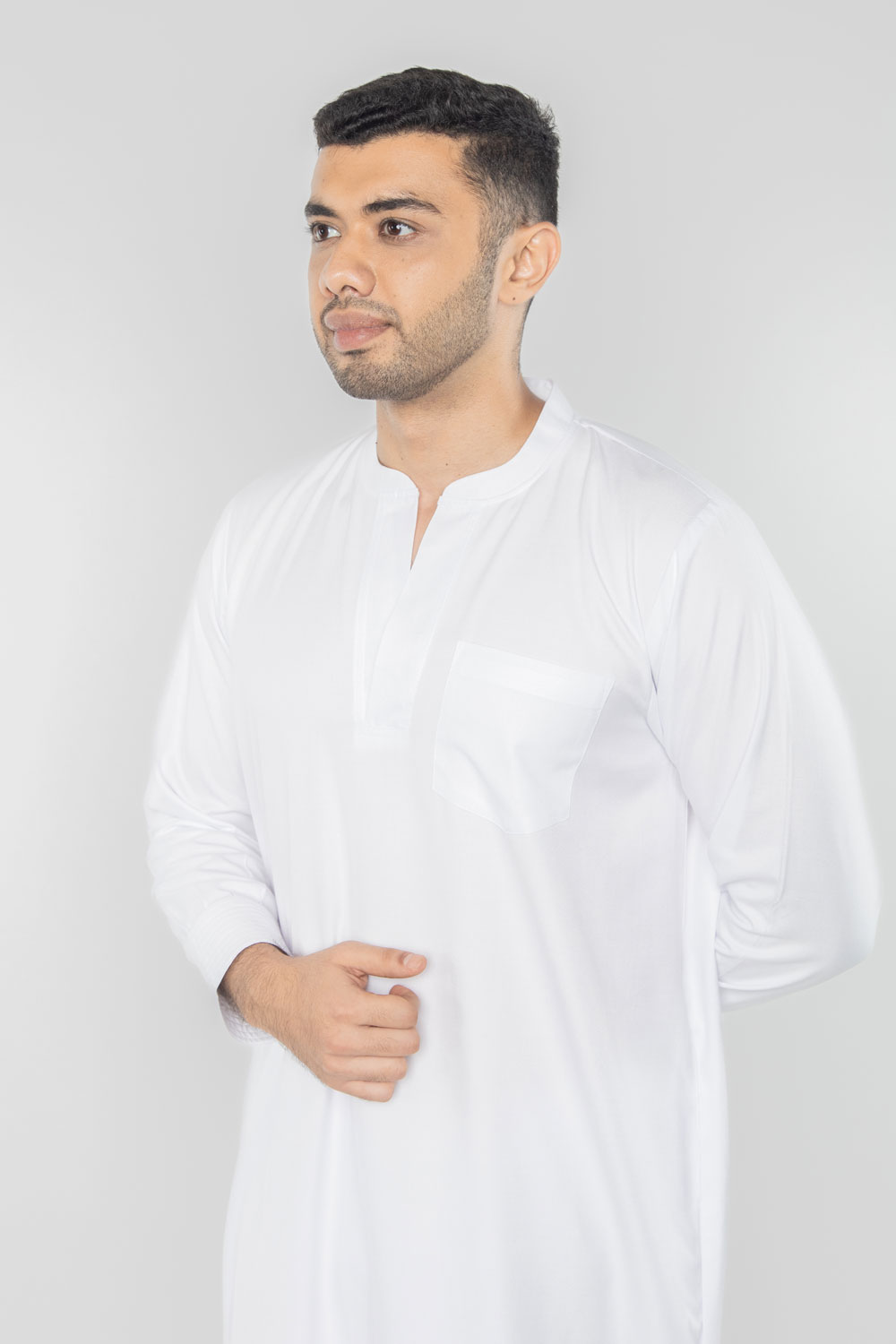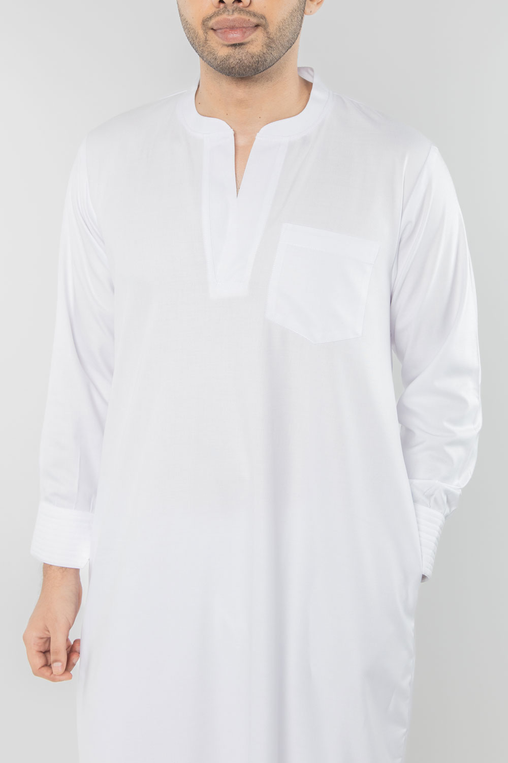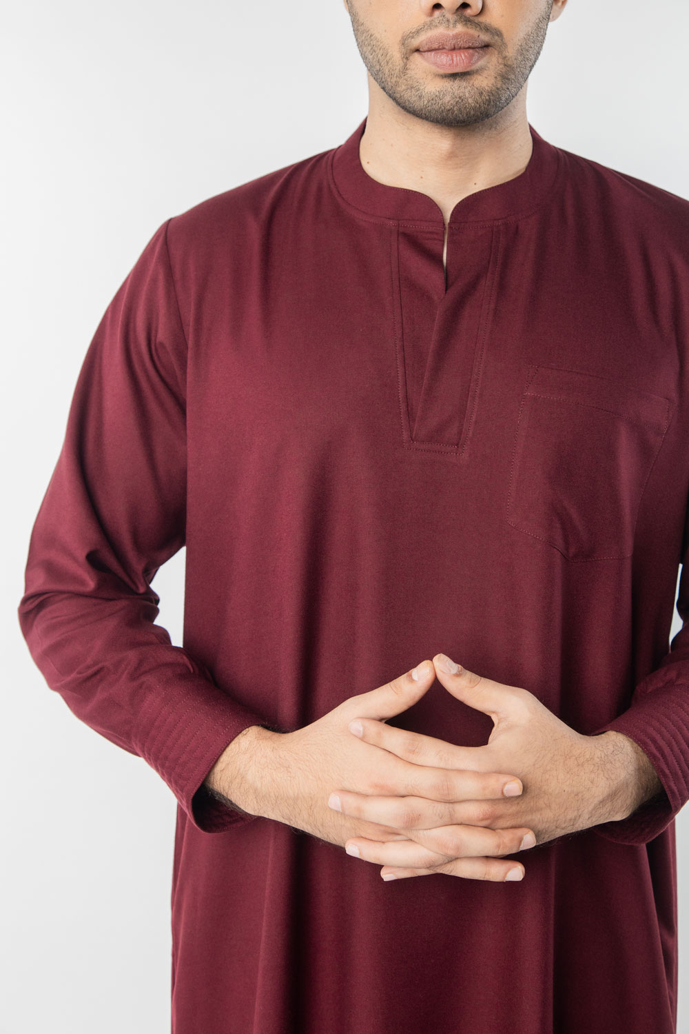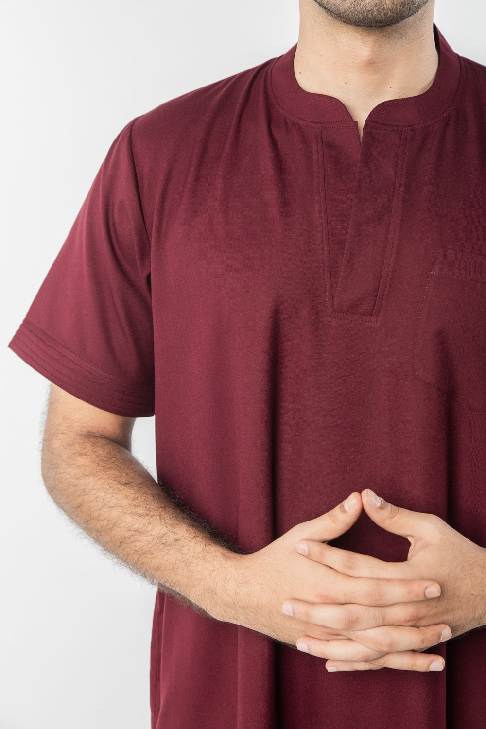 Neckline: Round neck with a short V-slit or notched round neckline
