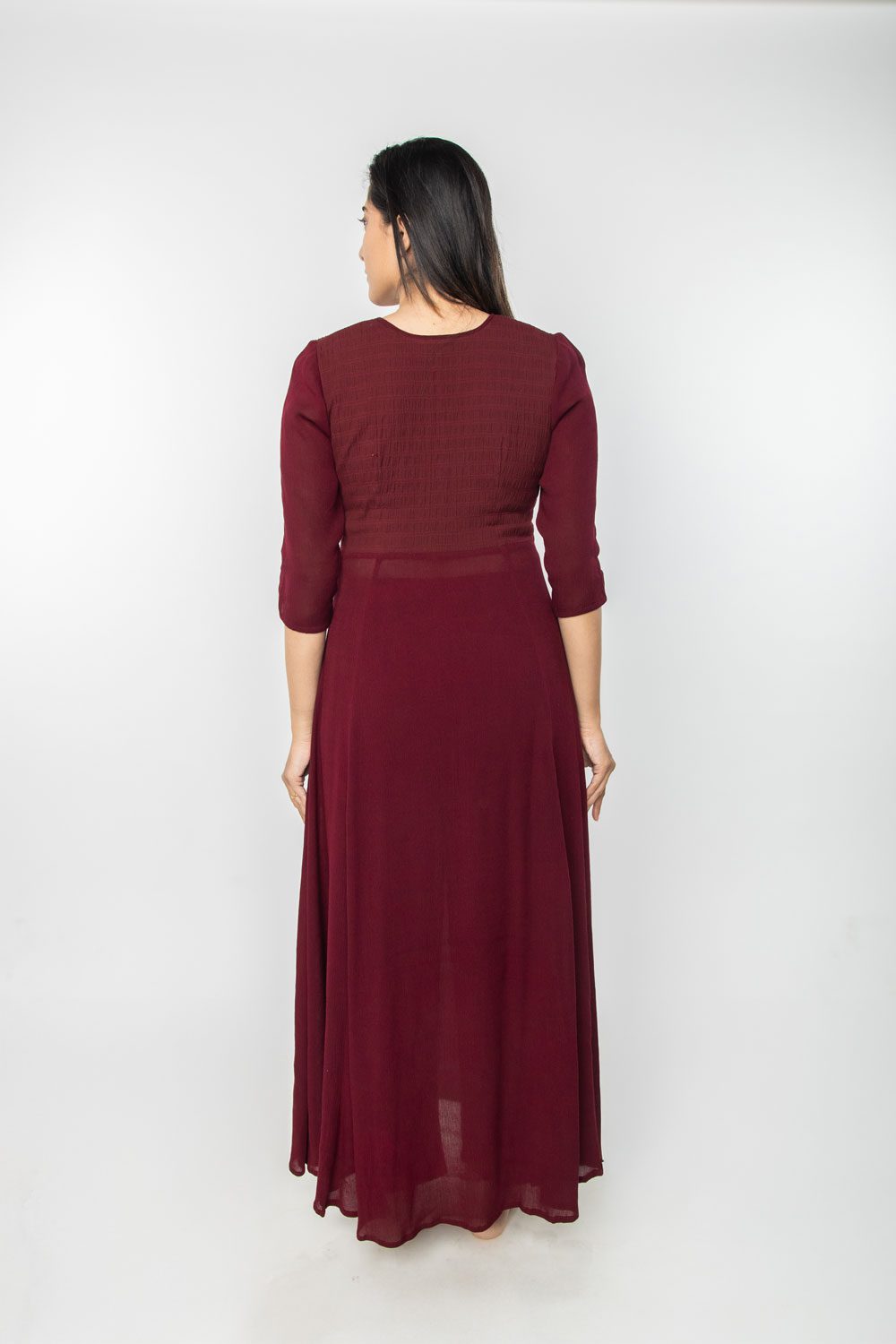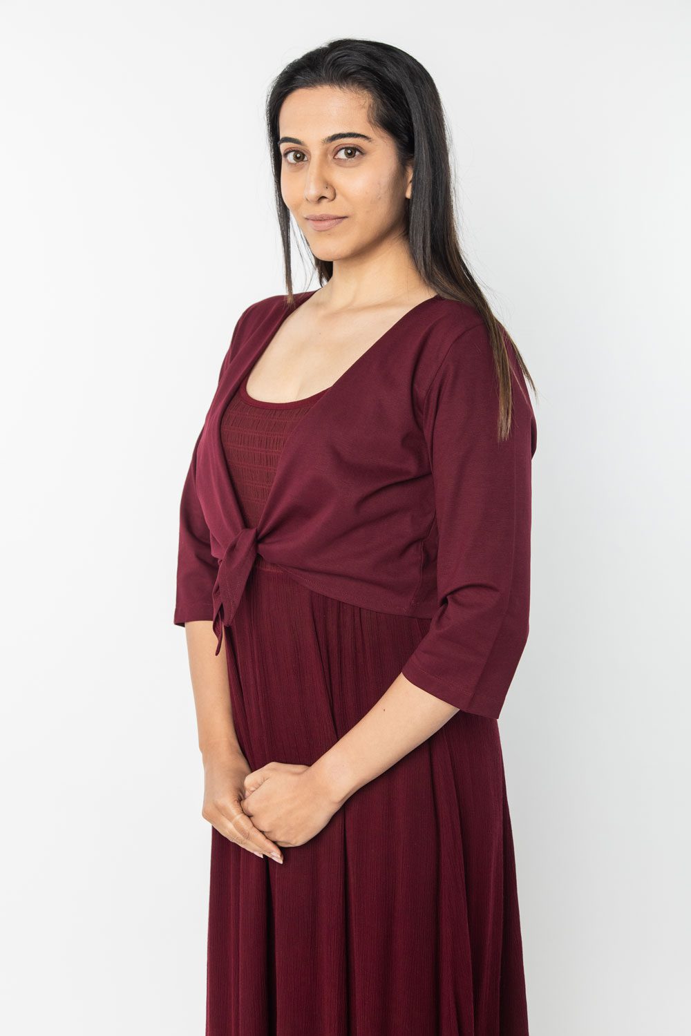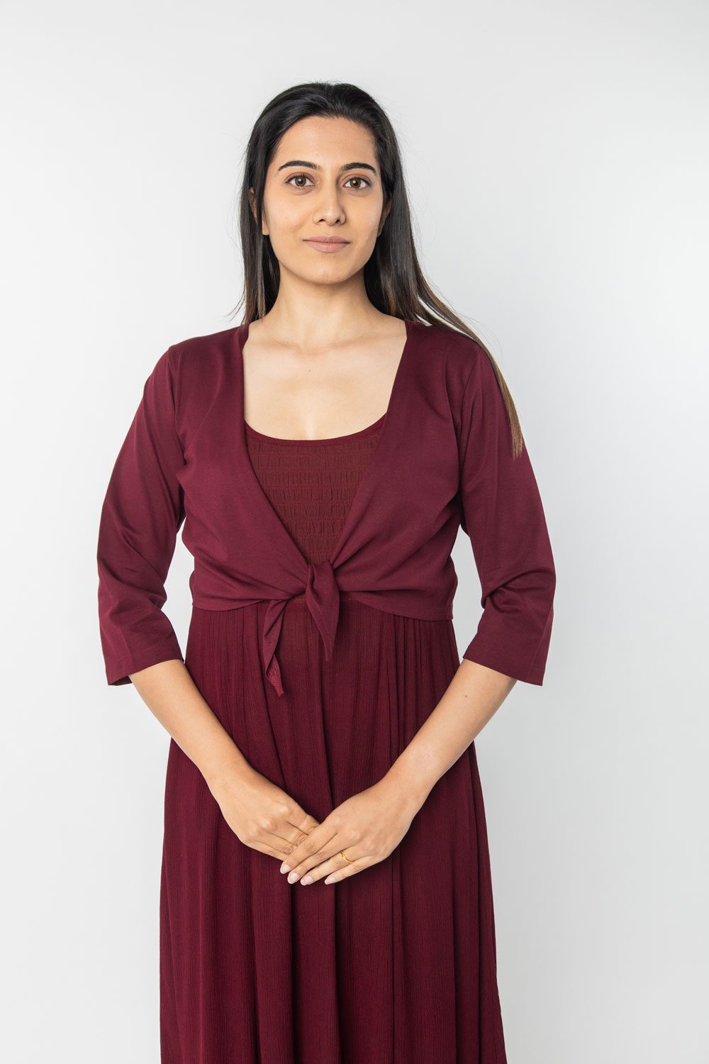 This elegant maroon shrug is crafted from soft, breathable fabric, perfect for layering over meditation robes or casual outfits. With its open-front design and relaxed fit, it offers both comfort and ease of movement.
